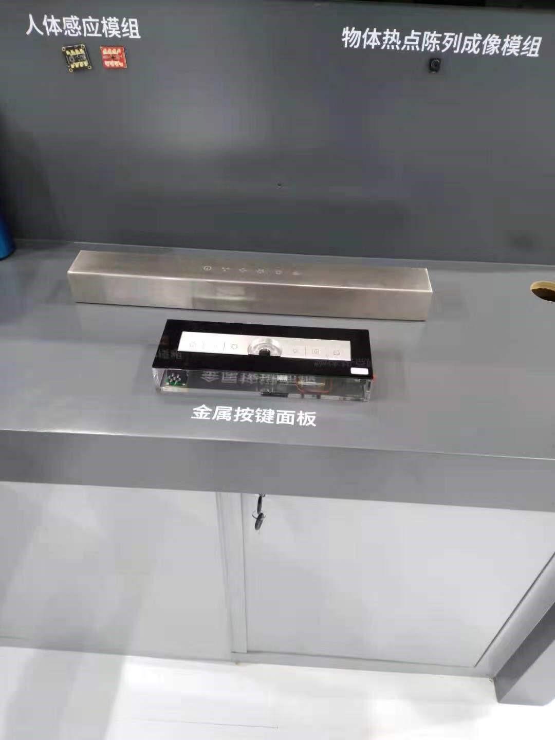 此次展出的新型家电控制面板外观如下图所示,与传统的控制面板相比,它最大的特点就是没有实体按键,因此面板表面不需要开孔开槽,这样的设计一是美观,尤其在一些高端品牌的产品上使用,使得整个产品外观呈现整体性的设计特点,二是由于取消了实体按键,因此也避免了实体按键和开孔之间的间隙,在油烟环境下使用时有效阻止了油烟等异物的渗透,并且在使用者手上沾有液体的情况下进行按压,也不会使液体侵入按键中,延长了产品的使用寿命。