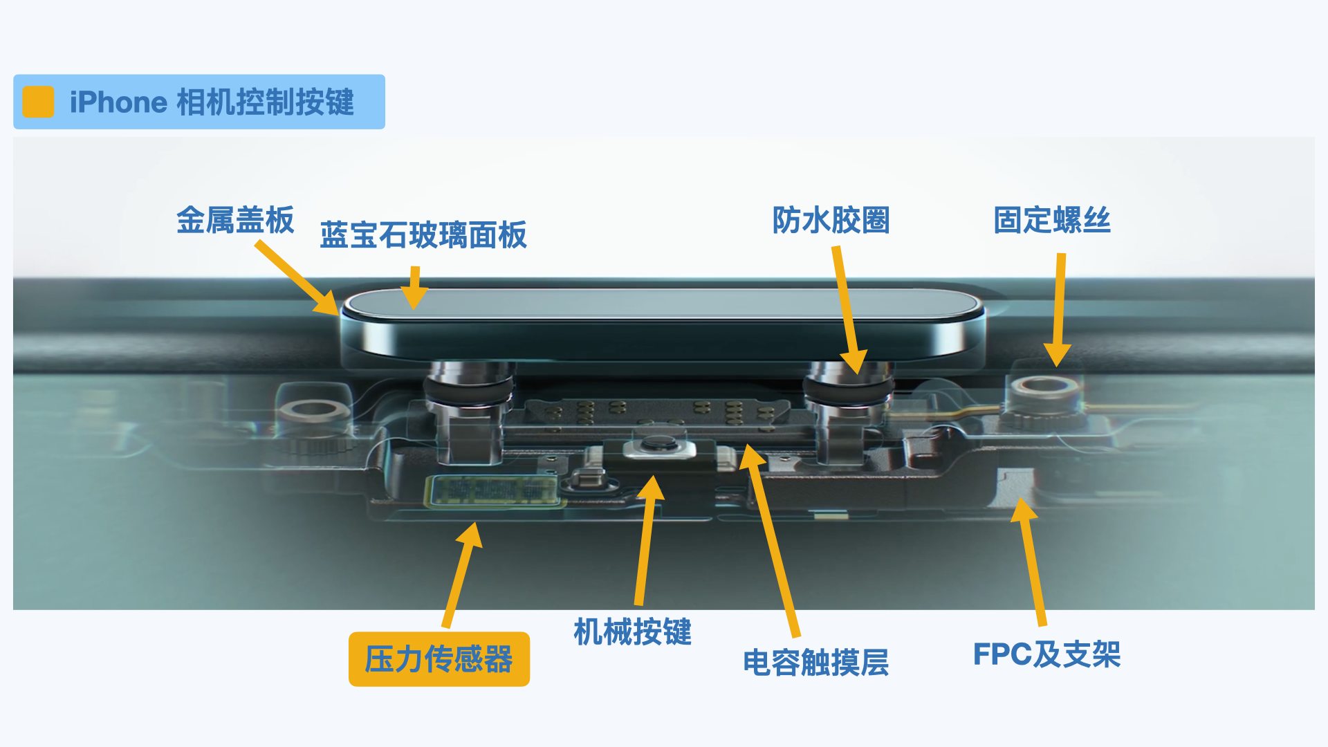 苹果在iPhone16系列带来了全新的相机控制按键,该按键结构复杂,包括电容感应层,机械按键,以及压力传感器。(结构图如下)