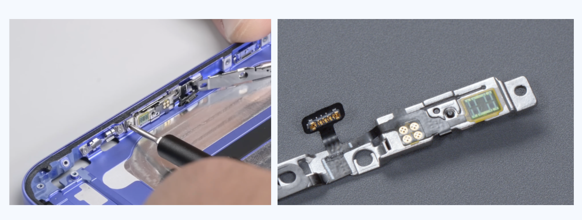 该按键电子结构通过螺丝固定在蓝宝石面板的键帽下,使用FPC排线与主板相连。拆下盖板后可见该模块集成了电容触摸层,机械按键,压力传感器以及金属基板。